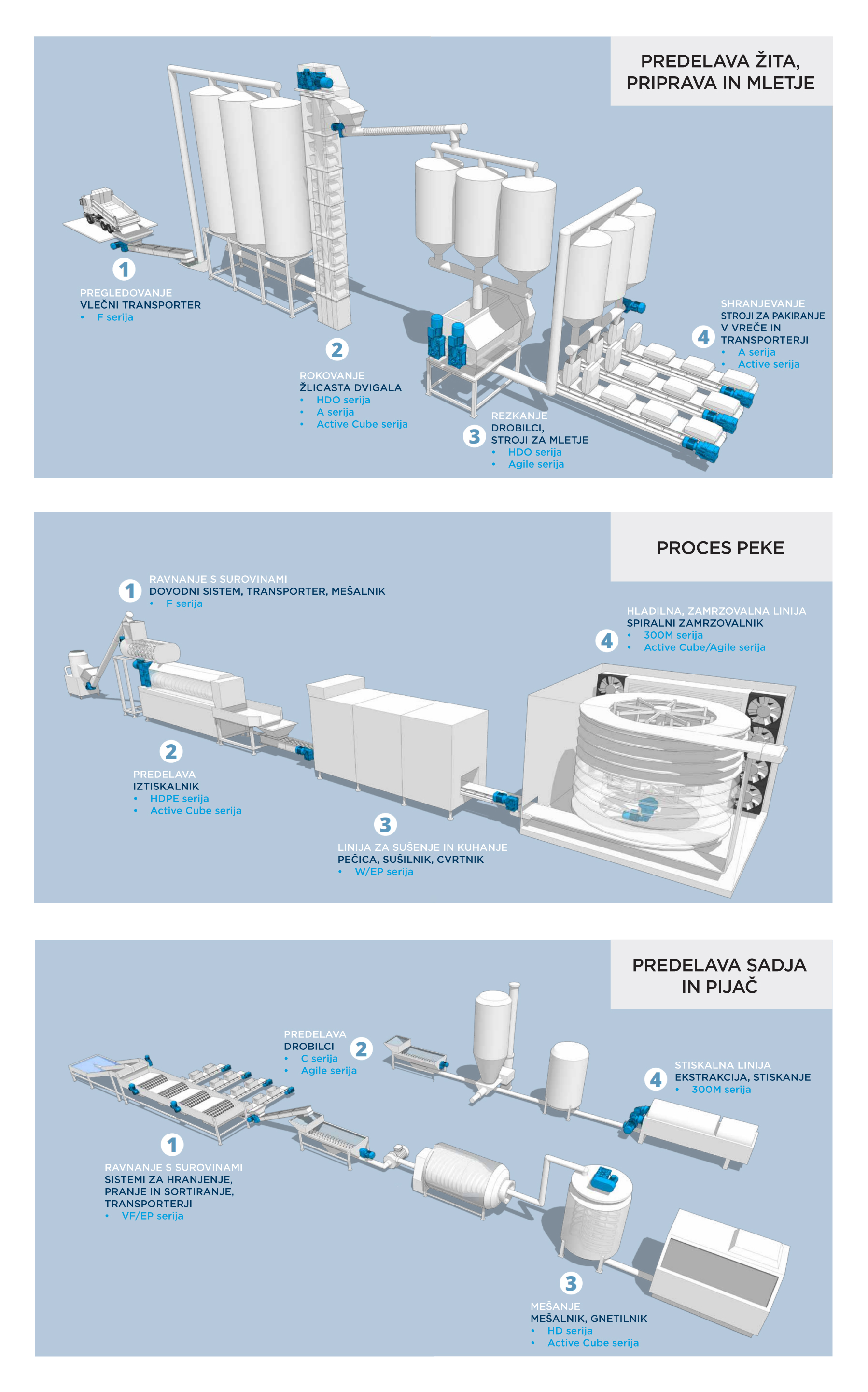 - Ravnanje s surovinami je prva faza procesa peke. Stroji morajo zagotavljati neprekinjeno delovanje, da se prepreči prekinitev procesa peke. Za vse te zahteve ponujamo rešitve, katere tudi izpolnjujemo.